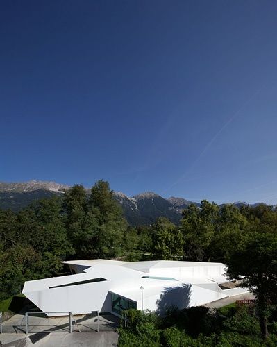 Drei Arbeitsbereiche für Malerei/Grafik, Bildhauerei/Architektur und Film/neue Medien bilden gemeinsam mit dem Foyer im Zentrum ein Raumkontinuum, nach Norden zum Grünraum großzügig geöffnet, nach Süden zum Hallenbad schützend geschlossen. Die Positionierung auf dem Grundstück und die Gabelung in der Gebäudeform schaffen Außenräume mit unterschiedlichem Charakter: wohnlich die Terrassen Richtung Park, roh und unempfindlich die Asphaltfläche im Osten, intim der lauschige Hof zur Sill hin. Materialisiert wurde das Gebäude komplett aus roh belassenem Brettsperrholz (BBS) in Fichte, eingesetzt als schlanke, ungedämmte 10 cm-Wandkonstruktion, mit doppellagigen Deckenplatten und in reduzierten Dimensionen für alle Einbauten und Möbel. Geheizt wird mit einer simplen Luftventilationsheizung wie in Werkstätten üblich, Warmwasser und Strom holt man sich idealerweise vom benachbarten Hallenbad. Als Fassade wurde eine weiße EPDM-Membrane rundum von der Decke zum Boden gespannt und verschweißt. Provisorisch und roh, warm und wohnlich zugleich fühlt es sich hier an. Es ist ein Raum der unterschiedliche Haltungen zulässt und Potenziale anbietet, in jedem Sinn des Wortes und der Lust macht selbst Hand anzulegen, zu verändern und mitzugestalten.