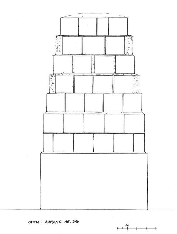 Die Rücksprünge sind stockwerksweise unterschiedlich, ebenso die Stockwerksabstände, die durch die angeschrägten Rücksprünge entstehen, aber nicht immer in logischer Abhängigkeit von deren Maßen. Die verschieden breiten, mit gröberem Putz verschlossenen Fugen bilden eine Beziehung zu den einfach seitlich zugeputzten Kacheln an den Ecken jeder zweiten Reihe. Die Abschlussreihe enthält eine schmälere, nur 12 cm breite „Ausnahmekachel“. Der Abschluss des Körpers nach oben ist eine ganz flache gerundete Pyramide, hin zum „Lichtschacht“ in der Mitte.