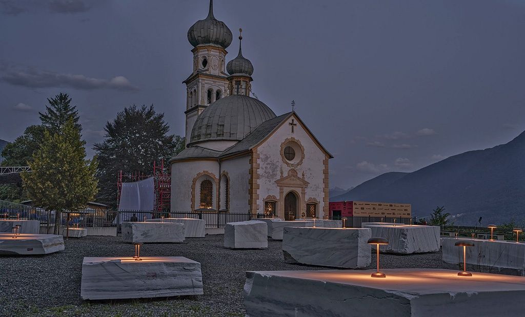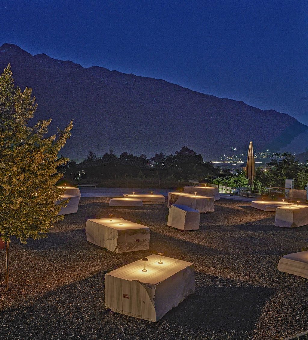 So entstand die Idee zu den Marmorblöcken aus Laas, wenngleich nicht ganz so direkt, wie es erscheinen mag. Man dachte nie an weiße „Hussen-Stehtische“, aber durchaus auch an Gebautes. Ein erlebtes Missgeschick war dann Auslöser dafür, nach Laas zu pilgern. Denn auf einer Baustelle färbte das Schalungsöl die marmormehlgefärbten weißen Fertigteile gelblich und Laas war in Erinnerung geblieben. Dort suchte man dann nach Begegnung mit der so großzügigen Frau Patscheider die verschiedenen Blöcke aus, wobei deren unterschiedliche Charaktere auch Einfluss auf die Anordnung am Birkenberg hatten.