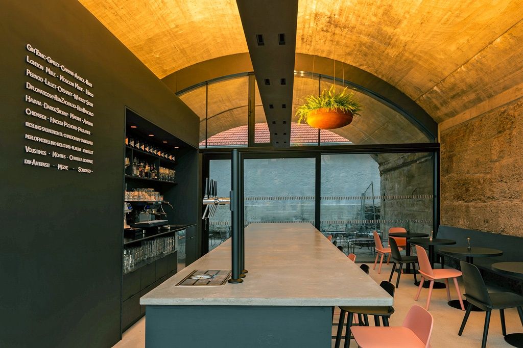 Das Besondere am freien Bogen 69 und den benachbarten Bögen ist der Umstand, dass um 1910 an dem bereits 1856 fertiggestellten Bahnviadukt das sogenannte „Schlachthofgleis“ in gleicher Bauweise angebaut wurde. So entstanden jeweils zwei fast identische, aneinander gestellte Bogenräume, die zu beiden Seiten offen sind. Die konzeptionelle Entscheidung den straßenseitigen, neun Meter tiefen Raum als Innenraum auszustatten und die zweite, fünf Meter tiefe Zone als Außenraum, als große Loggia zu belassen, macht aus diesem Lokal etwas, was man als Ort3 empfinden kann – denn das „Ungenützte“ erzeugt Großzügigkeit und eine Verklammerung mit der Umgebung. Dass die große Loggia, an der ein Radweg vorbeiführt, auf die Rückseite eines fünf Meter entfernten niederen Gebäudes schaut, vergrößert diese eher optisch, als dass es stört. Hier ist ein selten klares und vor allem auch kraftvolles Raumgefüge aus der bewussten Rücksichtnahme auf den Bestand entstanden. Möglicherweise hat auch die Fuge zwischen den beiden aneinander gebauten Bauteilen, die nicht abdichtbar ist, diese klare Entscheidung, neben dem knappen Budget, beeinflusst.