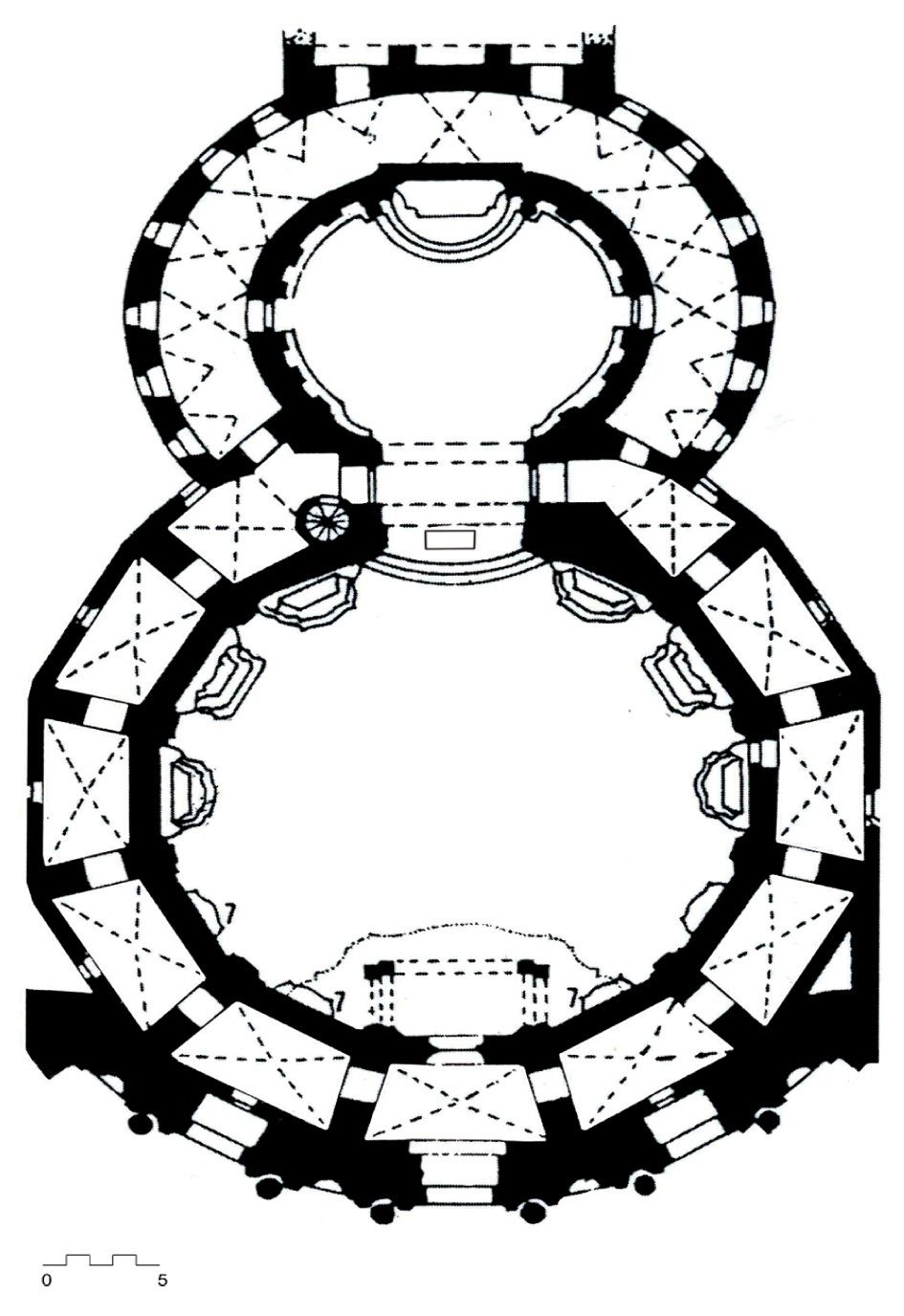 Gegründet wurde das Kloster 1330. Es entstand der gotische zwölfeckige Zentralbau mit einer Mittelsäule, die wie ein Baum, ein sternförmig ausstrahlendes Rippengewölbe trug, und an der der Altar stand. Ab 1710 kommt es zu unterschiedlichen Baumaßnahmen im Zuge der Barockisierung. Die ersten an der Fassade sind eigentlich nicht besonders geglückt – sie ziehen sich bis ins 20. Jahrhundert. Im Inneren ist jedoch in mehreren Schritten eine neue, bemerkenswerte und völlig untypische Raumkonfiguration entstanden. Zuerst wurde der kleine östlich angefügte Chorraum abgebrochen und mit einem überkuppelten Zentralraum – eigentlich ein Queroval mit den Achsen von 3/5 bzw. 1/2 des Zentralraumdurchmessers – ergänzt und durch ein hohes „Tor“ mit dem Hauptraum verbunden.