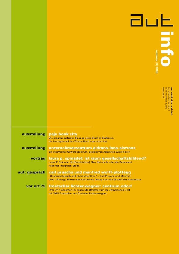 aus dem inhalt - Ausstellung „Paju Book City“ - eine Ausstellung über die programmatische Planung einer Stadt in Südkorea, die konzeptionell das Thema Buch zum Inhalt hat. - Ausstellung „Technologie und Landschaft. Unternehmerzentrum Aldrans-Lans-Sistrans“ – ein innovatives Gewerbezentrum, geplant von Johannes Wiesflecker. - Programm des aut zwischen Mai und Juni 2006, u. a. mit Vorträgen von Kim Young-joon, Suh Hailim, Jang Yoon-gyoo, Larua Spinadel und Reinhard Gassner sowie einem Gespräch zwischen Carl Pruscha und Manfred Wolff-Plottegg - Vorschau auf das Programm der Architekturtrage 2006 - Fortsetzung des aut: feuilleton mit einem Beitrag von Werner Burtscher