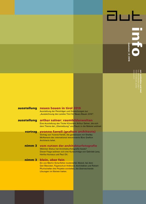 Im Mittelpunkt dieser Ausgabe der aut: info steht zum einen die Ausstellung „Neues Bauen in Tirol 2016“ und damit die alle zwei Jahre vergebene "Auszeichnung des Landes Tirol für Neues Bauen 2016". Die Ausstellung der Preisträger und sämtlicher eingereichter Projekte bietet den BesucherInnen des aut die Möglichkeit, sich einen Überblick über das aktuelle Architekturgeschehen in Tirol zu verschaffen.