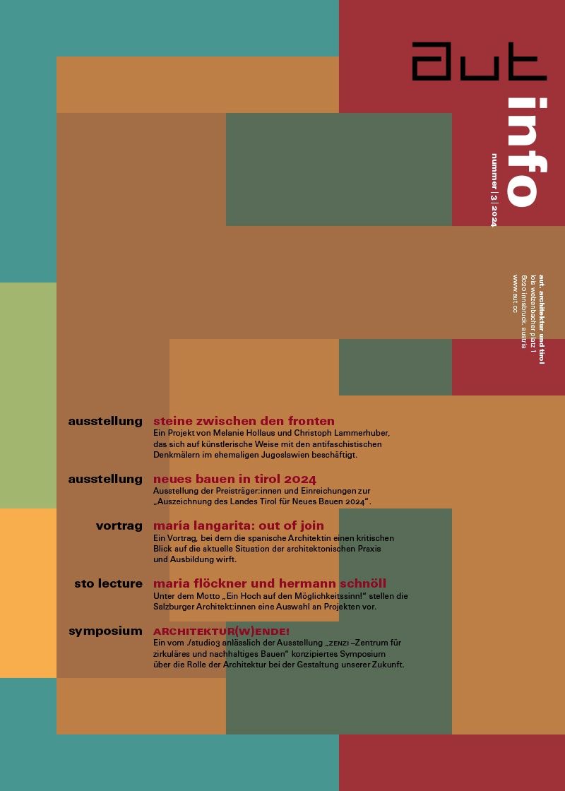 In der aut: info 3/24 finden Sie Hintergrundinformationen zu diesen Ausstellungen sowie zu all unseren Veranstaltungen bis Feber 2025, darunter Vorträge von María Langarita, Nina Mair, Maria Flöckner und Hermann Schnöll sowie Mathieu Wellner sowie das in Kooperation mit dem ./studio3 der Universität Innsbruck veranstaltete Symposium "ARCHITEKTUR(W)ENDE", das von einer im Feber gezeigten Ausstellung über das "ZENZI – Zentrum für zirkuläres und nachhaltiges Bauen" begleitet wird.