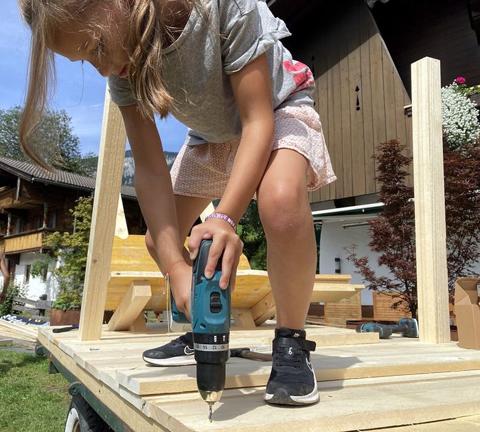 Einen ganzen Nachmittag lang wird gemeinsam gesägt, geschraubt, gebohrt, gehämmert, gemalt und vieles mehr. Bei diesem großen Experiment erfahren wir spielerisch, wie lustvoll das Bauen mit recycelten Rohstoffen sein kann.