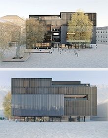 Aus dem für den Neubau ausgeschriebenen zweistufigen EU-weiten Wettbewerb ist das Projekt von Erich Strolz im Herbst 2014 als Sieger hervorgegangen, das die u. a. mit Ernst Beneder, Nathalie de Vries und Elke Delugan-Meissl prominent besetzte Jury etwa wegen seiner selbstverständlichen, kompakten Lösung des komplexen Raumprogrammes überzeugte. Die gemeinsam mit den nunmehrigen ARGE-Partnern Dietrich | Untertrifaller entwickelte, mehrschichtige Fassade aus dunklen Keramikelementen unterstützt das Grundkonzept, die für die öffentlichen Funktionen konzipierten Saal-Körper als eigenständige Elemente von den für Forschung, Lehre und Verwaltung genutzten Bereichen abzusetzen.