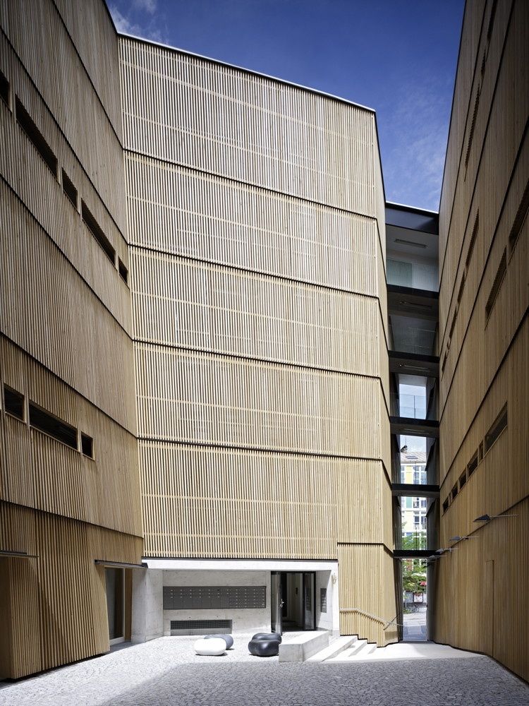 Nach außen präsentiert sich der an der Universitätsbrücke gelegene Solitär als auffälliger Monolith mit einer markant abgeschnittenen Ecke und rhythmisch versetzten Fensteröffnungen. Ein haushoher Eingangsschlitz führt in die komplett andersartige „Innenwelt“ des Baukörpers, wo zwei geknickte, gegeneinander verschobene, schräge Wandscheiben einen eigenständigen Raumkörper bilden. In Bezugnahme auf Hofsituationen in der Altstadt schufen die Architekten hier einen urbanen, mit Stöcklpflaster ausgelegten und von breiten Laubengängen erschlossenen Platz. Die Außenfassaden des nach allen Seiten differenziert auf den Straßenraum reagierenden Baukörpers sind verputzt und mit einer leicht glänzenden Farbe geweißt, die Innenhoffassaden im Kontrast dazu mit vertikalen Eichenlamellen verkleidet.