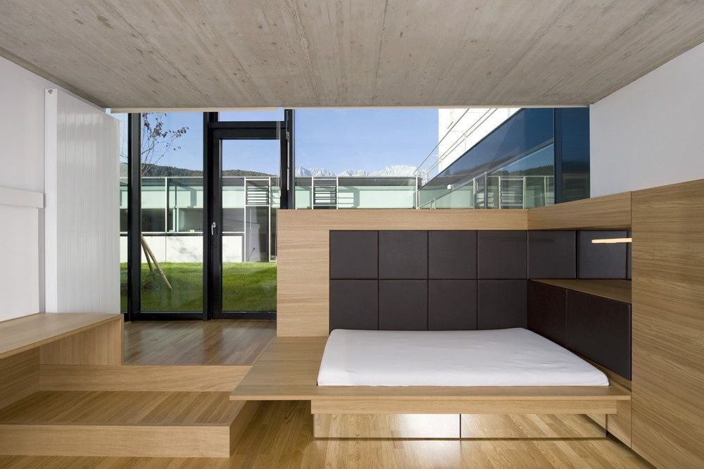Im 300 Jahre alten Bestandsbau wurden die baulichen Strukturen freigelegt, klare Eingriffe fanden nur dort statt, wo es auch aus funktionellen Gründen sinnvoll erschien. Direkt an den Altbau angeschlossen wurde ein lang gestreckter, leicht in den Boden abgesenkter Neubau errichtet. Zwei Zimmertrakte und der Verbindungsgang umschließen U-förmig einen begrünten Innenhof. Eine klare Formensprache – Wände und Decken sind schalrein in Ortbeton errichtet – kontrastiert als dezidiert zeitgenössische Ausformulierung mit dem historischen Bestand, großflächige Verglasungen schaffen optimale Lichtverhältnisse in den betont einfach eingerichteten Zimmern. Die begrünten Dächer, die nur knapp aus dem Gelände emporragen, lassen den Blick frei auf das barocke Stift, das Schigymnasium von Othmar Barth, Wald