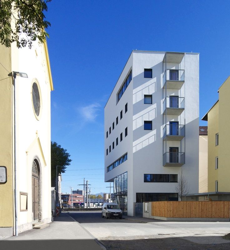In bewusstem Bezug zu Lois Welzenbachers Adambräu konzipierte Jörg Streli einen schmalen, sechsgeschossigen Turm, der den Straßenraum, v. a. auch den Vorplatz der benachbarten Karmeliterkirche freispielt. Neben der eigentlichen Notschlafstelle, die sich in den drei auskragenden Obergeschossen befindet, ist in der neuen, wesentlich größeren Mentlvilla nun auch die von der Caritas betriebene Anlaufstelle „komfüdro“ mit Beratungsräumen und einem caféartigen Aufenthaltsbereich untergebracht.