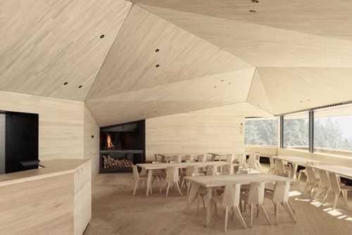 Ohne dass große Erdbewegungen notwendig wurden, platzierten sie das Volumen für den Gastronomiebetrieb mit an die 100 Sitzplätzen, eine Betreiberwohnung und ein Infozentrum an den oberen Rand der steilen Waldlichtung. Mit dem Ziel, den Neubau möglichst selbstverständlich in die Landschaft zu integrieren, wurden Teile des Volumens im Gelände versenkt und ein Teil der Terrasse direkt aus der Topografie entwickelt. Im Zentrum des organisch geformten Baukörpers liegt die Bar mit Ausschank, eine große und eine intimere kleine Stube öffnen sich über durchgehende Fensterbänder Richtung Sonne und Aussicht. Überspannt wird das Gebäude von einem vielflächig geneigten Dach, das auf der im Süden vorgelagerten Terrasse witterungsgeschützte Sitzplätze bietet.
