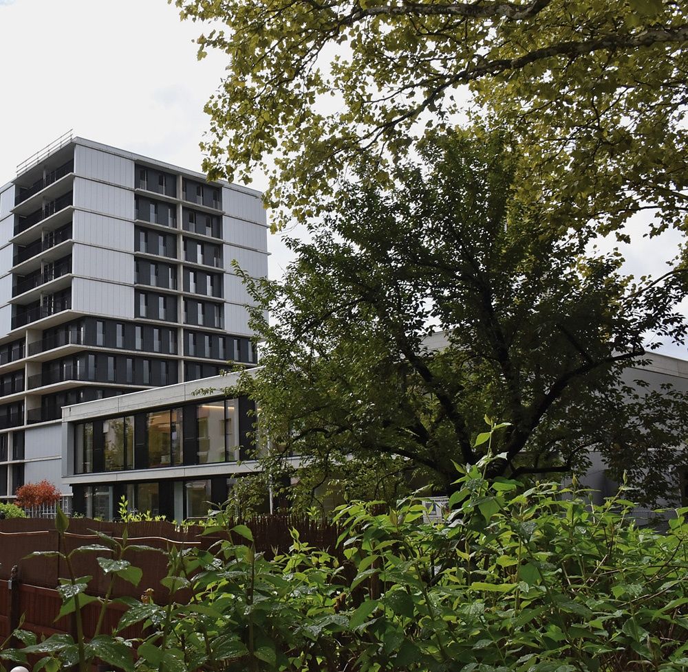 Im Rahmen des „Vor Ort“-Gesprächs führen die Architekten und Bauherrenvertreter durch das im Herbst fertig gestellte Ensemble, das auch als neues Stadtteilzentrum für die Reichenau fungiert.
